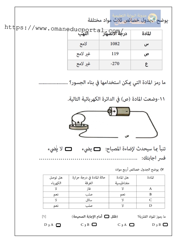 مراجعة في الوحدة الثامنة خصائص المادة في العلوم للصف السابع